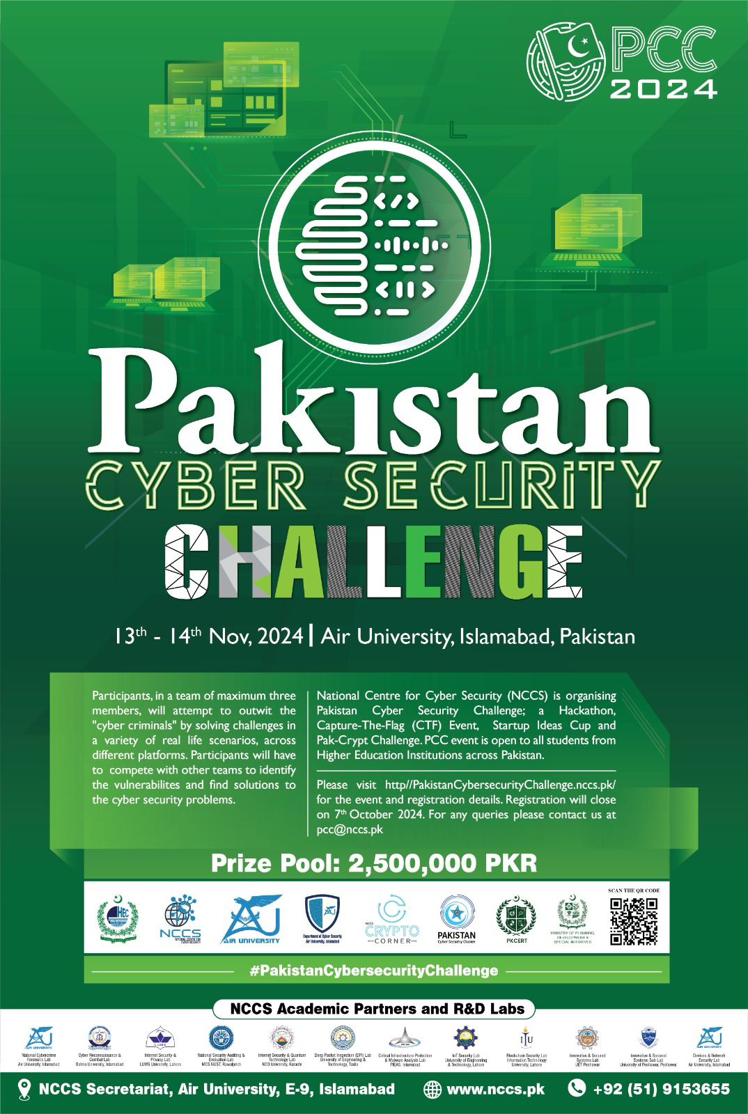 The National Centre for Cyber Security (NCCS), in collaboration with National CERT and its academic partners, is pleased to host the ๐ฃ๐ฎ๐ธ๐ถ๐๐๐ฎ๐ป ๐๐๐ฏ๐ฒ๐ฟ ๐ฆ๐ฒ๐ฐ๐๐ฟ๐ถ๐๐ ๐๐ต๐ฎ๐น๐น๐ฒ๐ป๐ด๐ฒ ๐ฎ๐ฌ๐ฎ๐ฐ at Air University, Islamabad. This premier event is designed to bring together Pakistanโs brightest minds in cybersecurity to solve real-world challenges.
