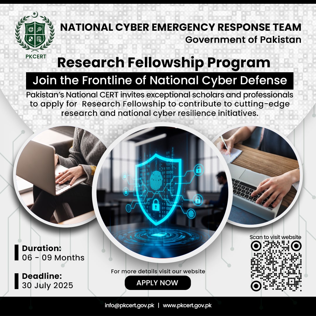 Pakistan’s National CERT invites exceptional scholars and professionals to apply for Research Fellowship to contribute to cutting-edge research and national cyber resilience initiatives.
